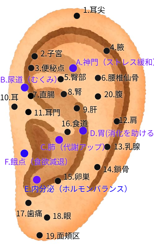 ・テキスト教材・ミニ耳つぼ模型・耳つぼ押し棒・ピンセット・アルコール綿花・耳つぼジュエリー10粒